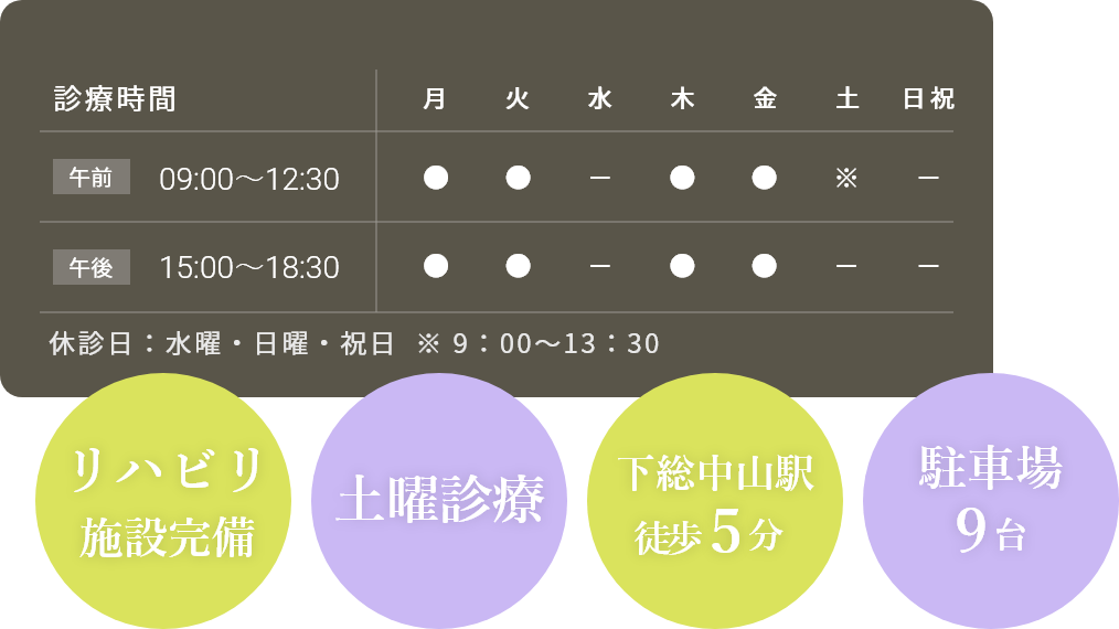 小谷整形外科クリニックは、JR総武本線「下総中山駅」から徒歩8分とアクセス良好です。また、京成本線「鬼越駅」や「京成中山駅」からも徒歩11分でご来院いただけます。駅からの道順も分かりやすく、お仕事帰りや買い物ついでにもお立ち寄りいただけます。特に足腰を痛めて治療されている方にとっては、駅から近いというのはたいへん大きな利点になります。
